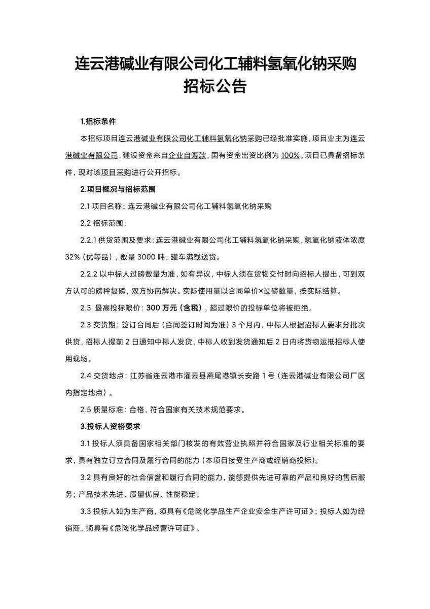 連云港堿業(yè)有限公司化工輔料氫氧化鈉采購招標公告