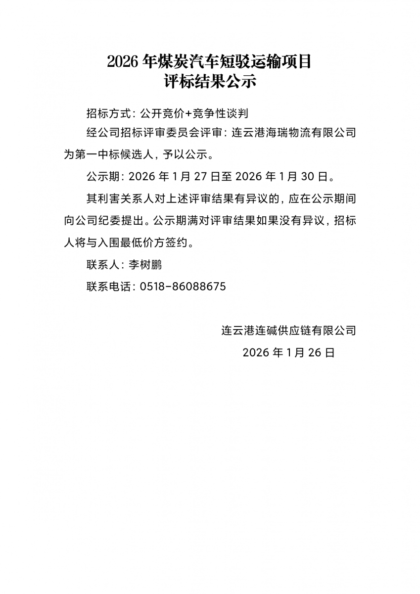 2026年煤炭汽車短駁運(yùn)輸項(xiàng)目評標(biāo)結(jié)果公示