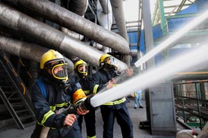 公司黨委書記、董事長張衛(wèi)民,黨委副書記、總經(jīng)理李清菊,副總經(jīng)理焦旺盛參加演練并提要求。健康安全環(huán)保部消防隊(duì)、熱電車間抽調(diào)精兵強(qiáng)將參加這次突發(fā)事件應(yīng)急預(yù)案實(shí)戰(zhàn)演練。