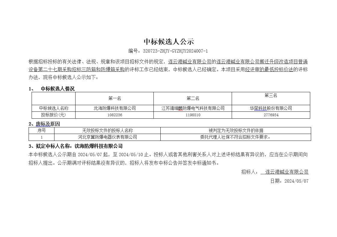 搬遷升級改造項目普通設(shè)備第二十七期采購招標三防箱和防爆箱采購中標候選人公示