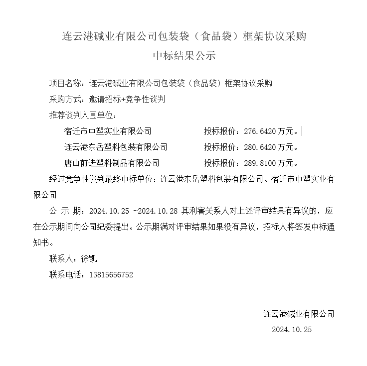 連云港堿業(yè)有限公司包裝袋(食品袋)框架協(xié)議采購中標(biāo)結(jié)果公示